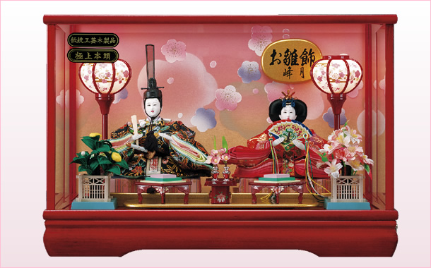 伝統と信用を重んずる「峰月」では、本年も頭、胴、お道具等の一つ一つまで責任と自信をもつ職人が、真心こめて丹念に仕上げた、優雅で気品あふれる格調高いお雛様を豊富に取り揃えました。