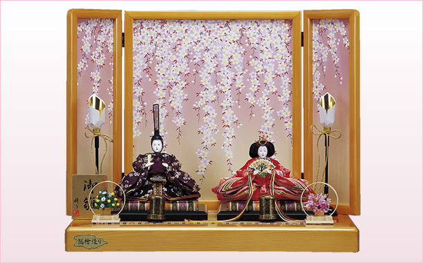 ヒノキ造りの屏風と飾り台。屏風は背高タイプで、しだれ桜が美しく描かれています。おひなさまには本仕立ての衣裳を着させました。 コンパクトながらも非常に風情のあるひなかざりです。 檜造り:檜(ひのき)・・・ヒノキ科の常緑高木。材は緻密で加工しやすく、最高の建築材としての用途がある。