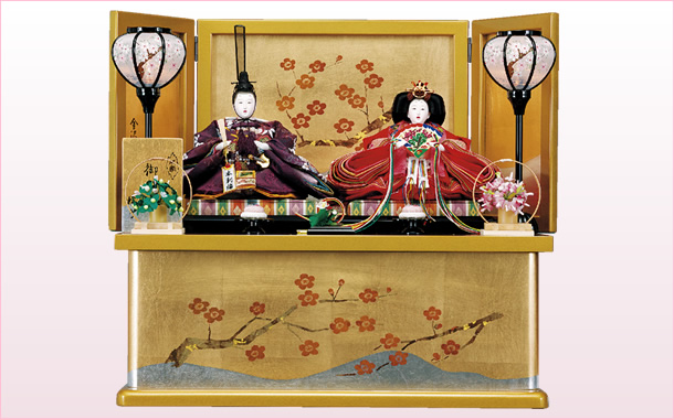 伝統ある金沢金箔をふんだんに使用した豪華な収納タイプです。品のある梅の図柄を描き、本刺繍衣裳をまとったおひなさまを配したこだわりの逸品です。