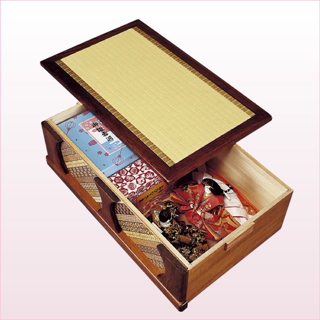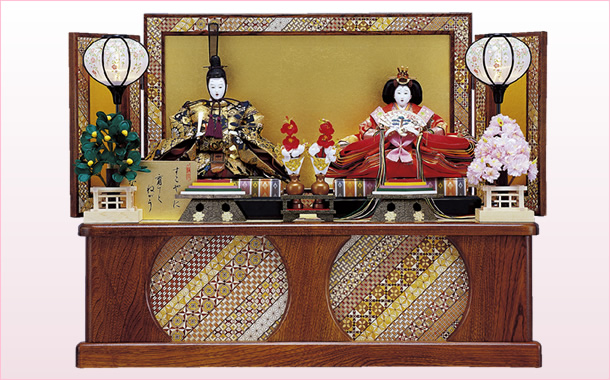 コンパクト収納タイプのひな飾りに伝統工芸の箱根寄木細工と施しました。豪華な本仕立て衣裳のおひなさまを配した味わいある逸品です。