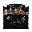 黒塗りの屏風と台。屏風には可愛らしい桜の図柄を配しました。美しい衣裳をまとった親王様。