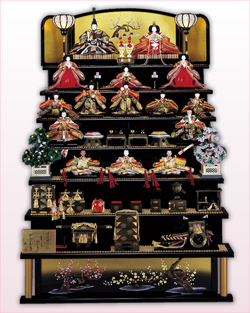 黒塗りの木製七段飾り台と屏風には、紅白梅に鶯が描かれた春を感じさせる風情のある絵柄です。特上金襴の十二単衣裳をまとったおひなさまを引き立てます。