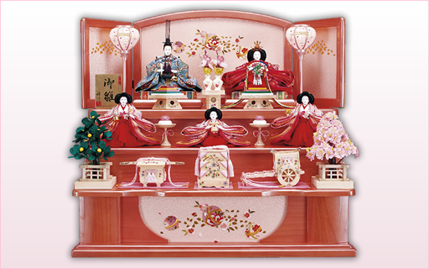 伝統と信用を重んずる「峰月」では、本年も頭、胴、お道具等の一つ一つまで責任と自信をもつ職人が、真心こめて丹念に仕上げた、優雅で気品あふれる格調高いお雛様を豊富に取り揃えました。