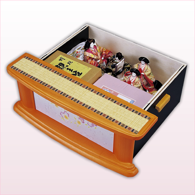 飾り台に収納ができ、収納時に困りません。きれいな山吹色の屏風と飾り台には可愛らしい桜の花が描かれ、可愛らしいお顔のおひなさまが絶妙なハーモニーを奏でます。お求めやすい逸品です。