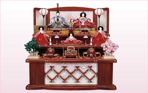 本桐の屏風と飾り台は木目を生かした家具調仕上げです。お道具には朱塗り仕上げを施し、友禅衣裳をまとったおひなさまとともに、やさしげな風情を醸し出しています。 本桐造り:桐(きり)…ゴマノハグサ科の落葉低木。材はたんす、小物入などの用途がある。