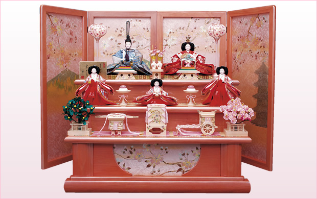本桐にパールピンク塗りを施した屏風と飾り台にはパールの金彩で描かれた遠山桜が見事です。お道具は白木にリボン桜。友禅衣裳のやさしいおひなさまが気品ある雰囲気です。 本桐造り:桐(きり)…ゴマノハグサ科の落葉低木。材はたんす、小物入などの用途がある。