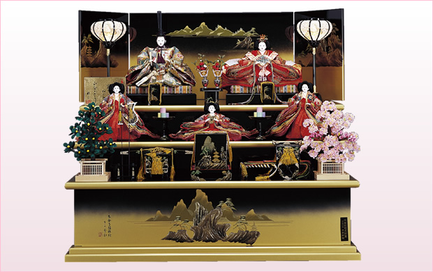 伝統と信用を重んずる「峰月」では、本年も頭、胴、お道具等の一つ一つまで責任と自信をもつ職人が、真心こめて丹念に仕上げた、優雅で気品あふれる格調高いお雛様を豊富に取り揃えました。