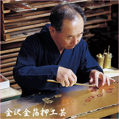 加賀百万石に育まれた伝統ある金沢金箔押し工芸の技をふんだんに用いた豪華な屏風と飾り台。金箔で描かれた梅の花が見事です。お道具にも伝統的な唐草蒔絵を施してあります。本金を使用した本仕立ての金襴衣裳のおひなさまを配したこだわりの逸品です。